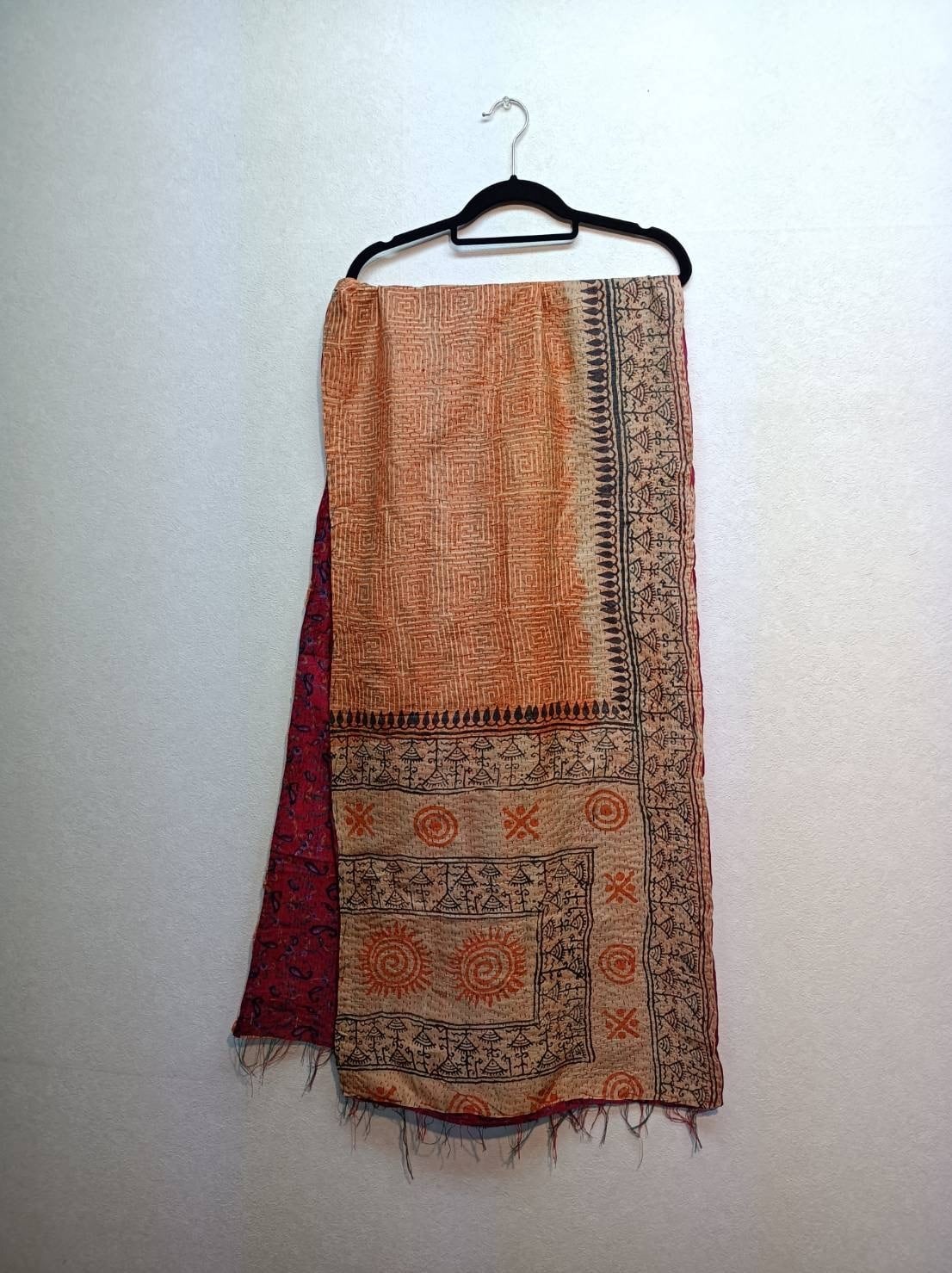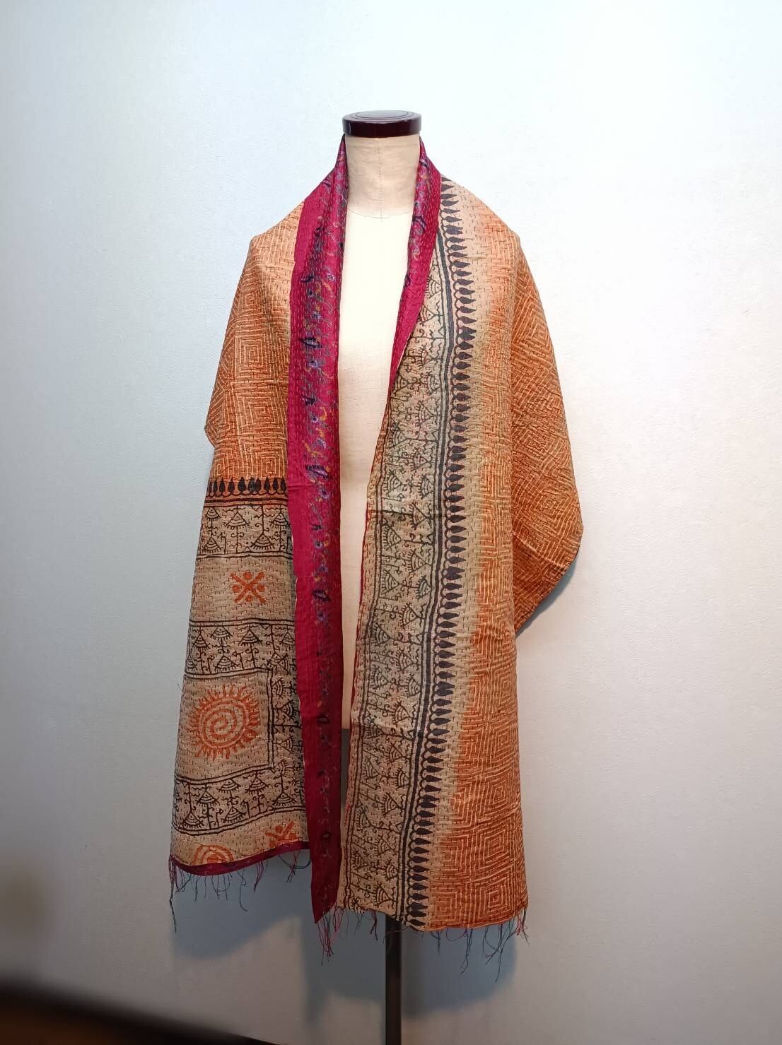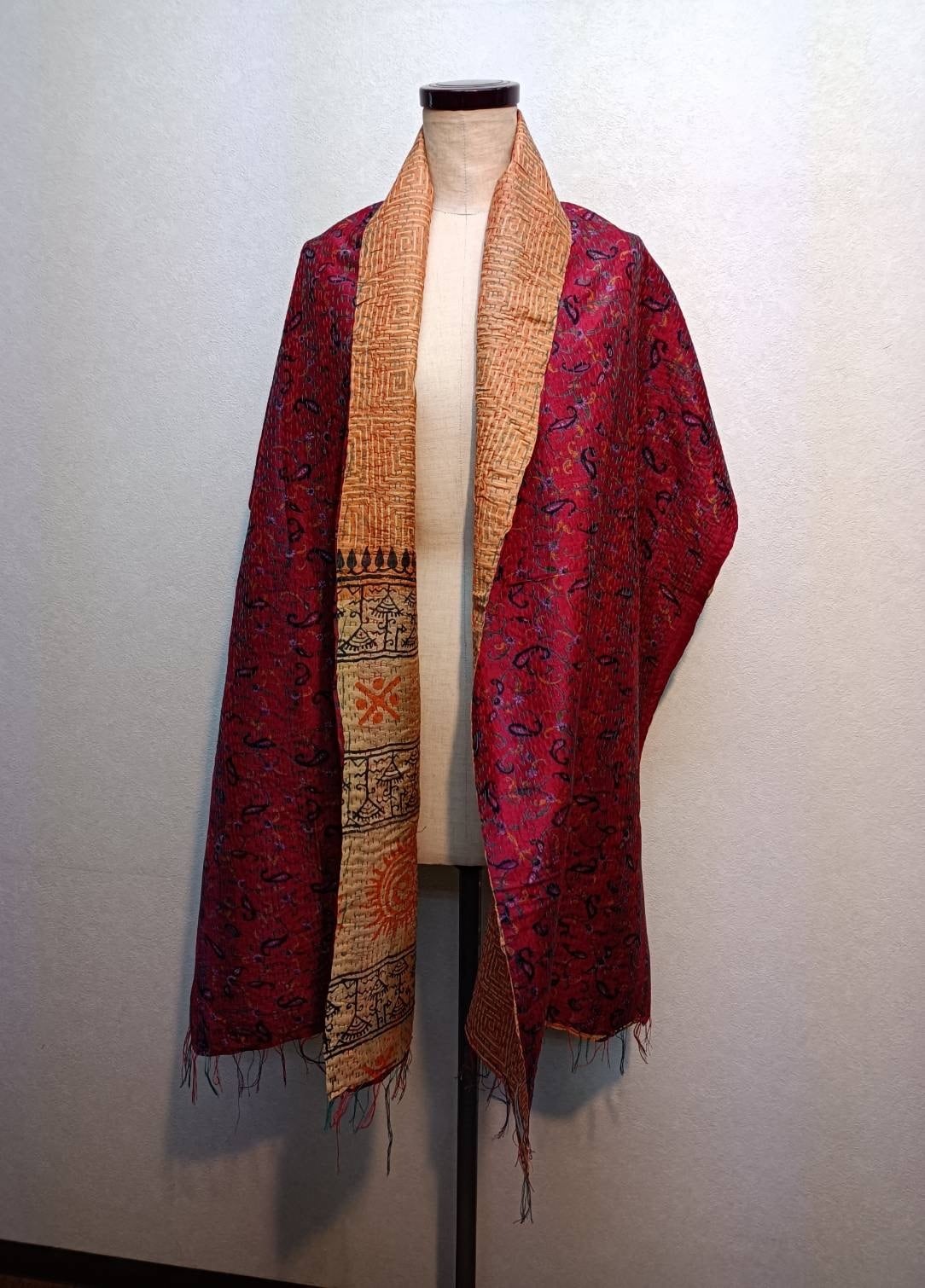 カンタ『Kantha』刺繍のストール リバーシブル ボルドー×オレンジ系