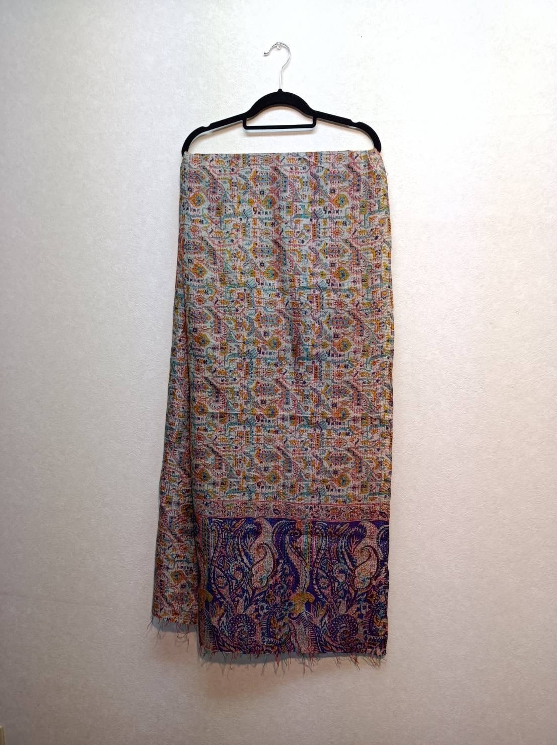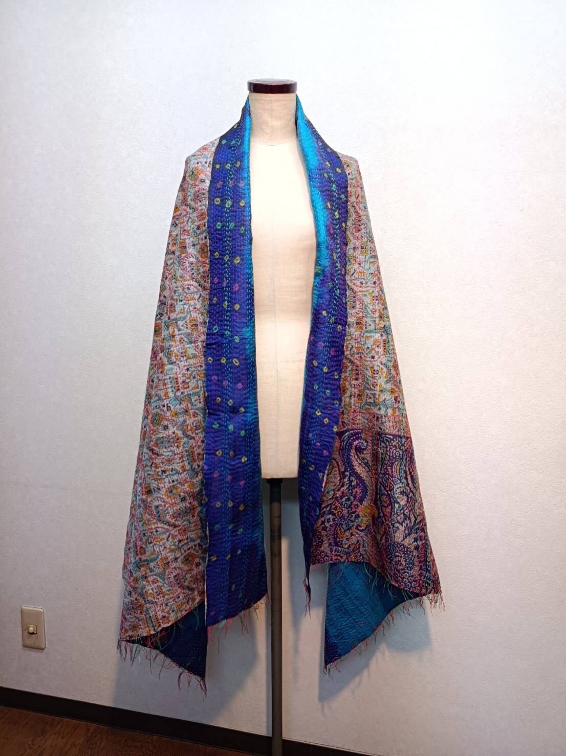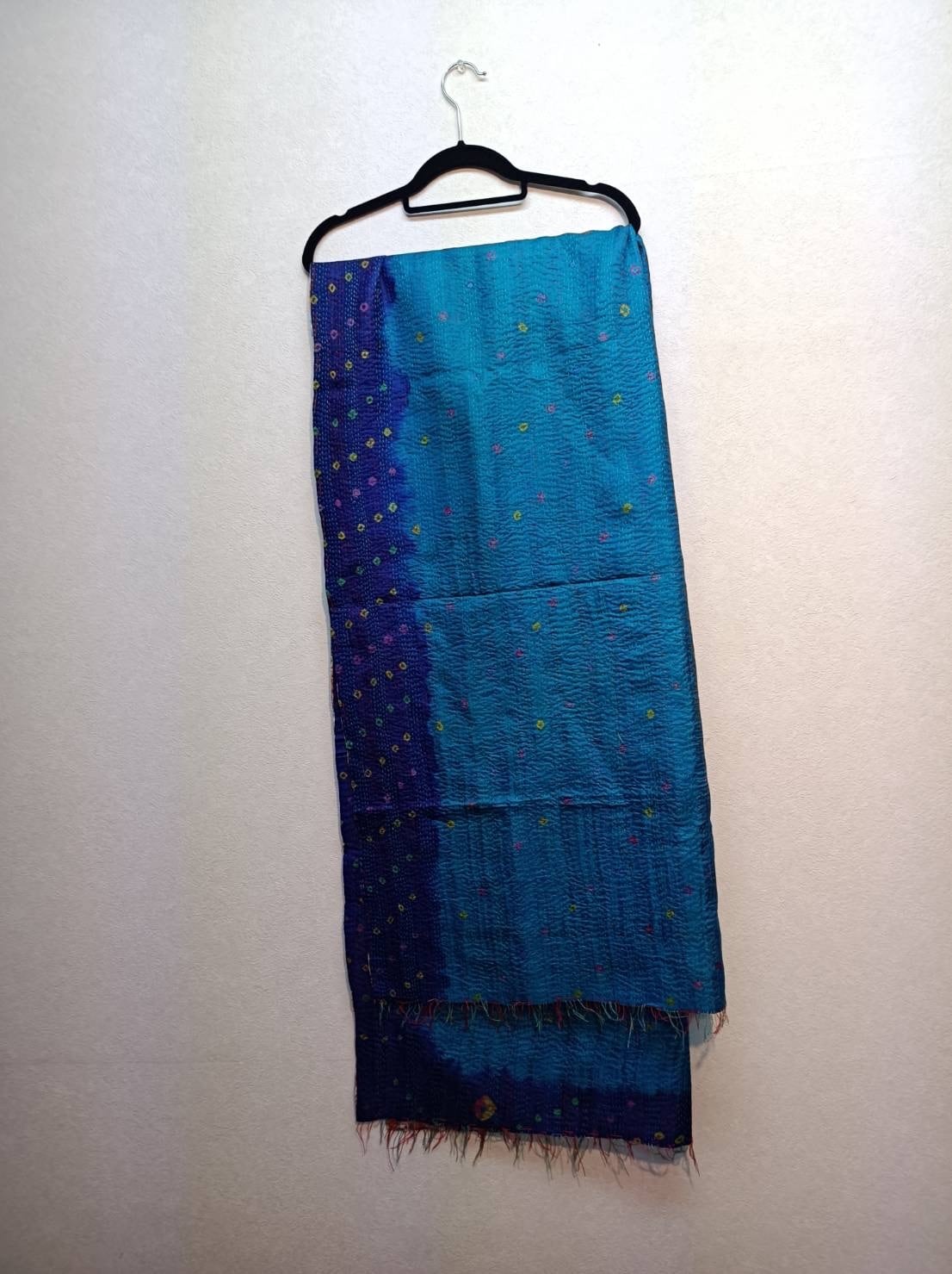 このストールは、サリーをアップサイクルして作られており、ひとつひとつ異なる美しい柄が施されています。