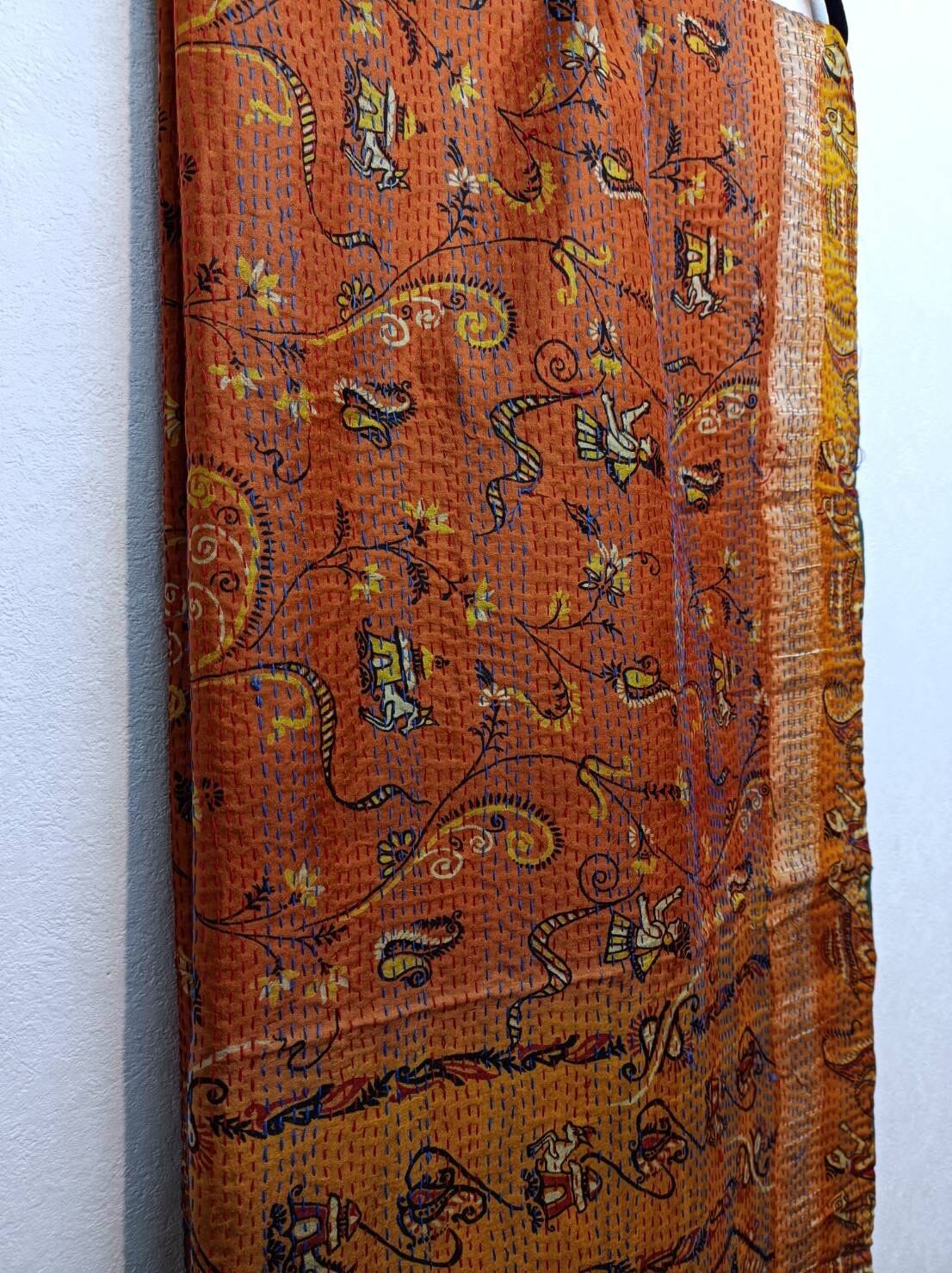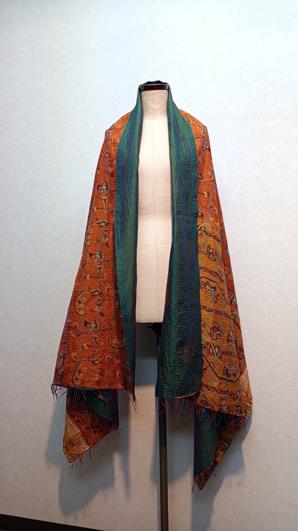 カンタ『Kantha』刺繍の大判ストール リバーシブル オレンジ×グリーン