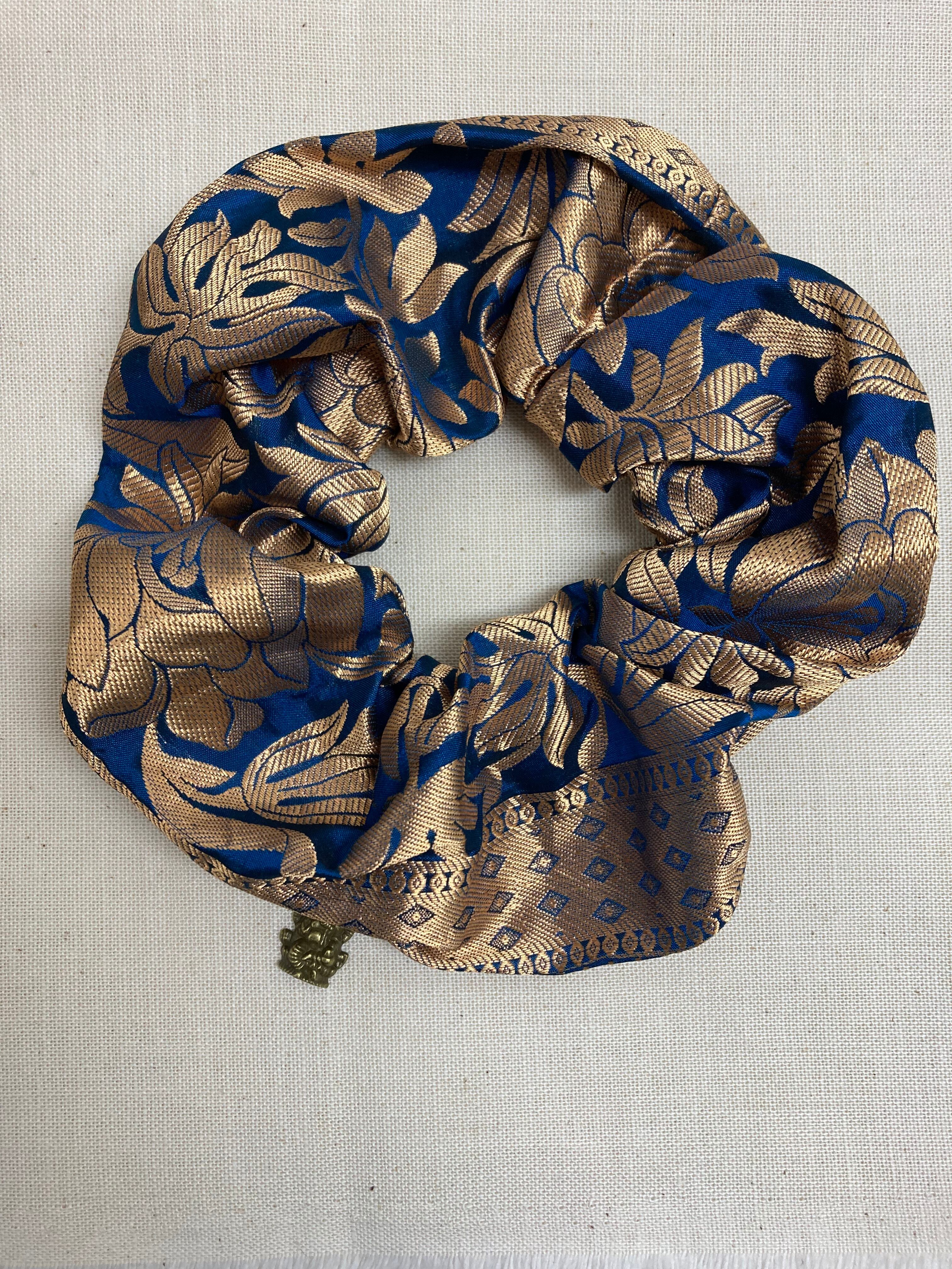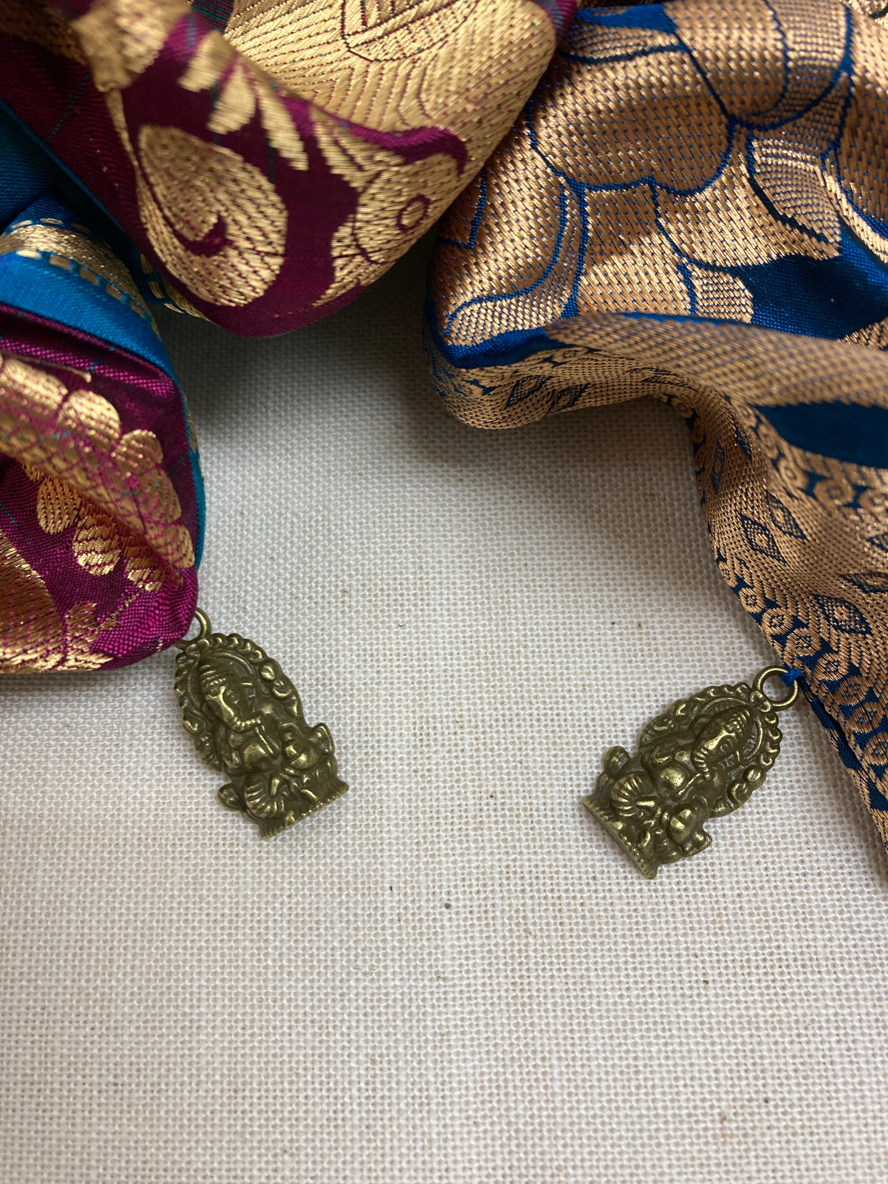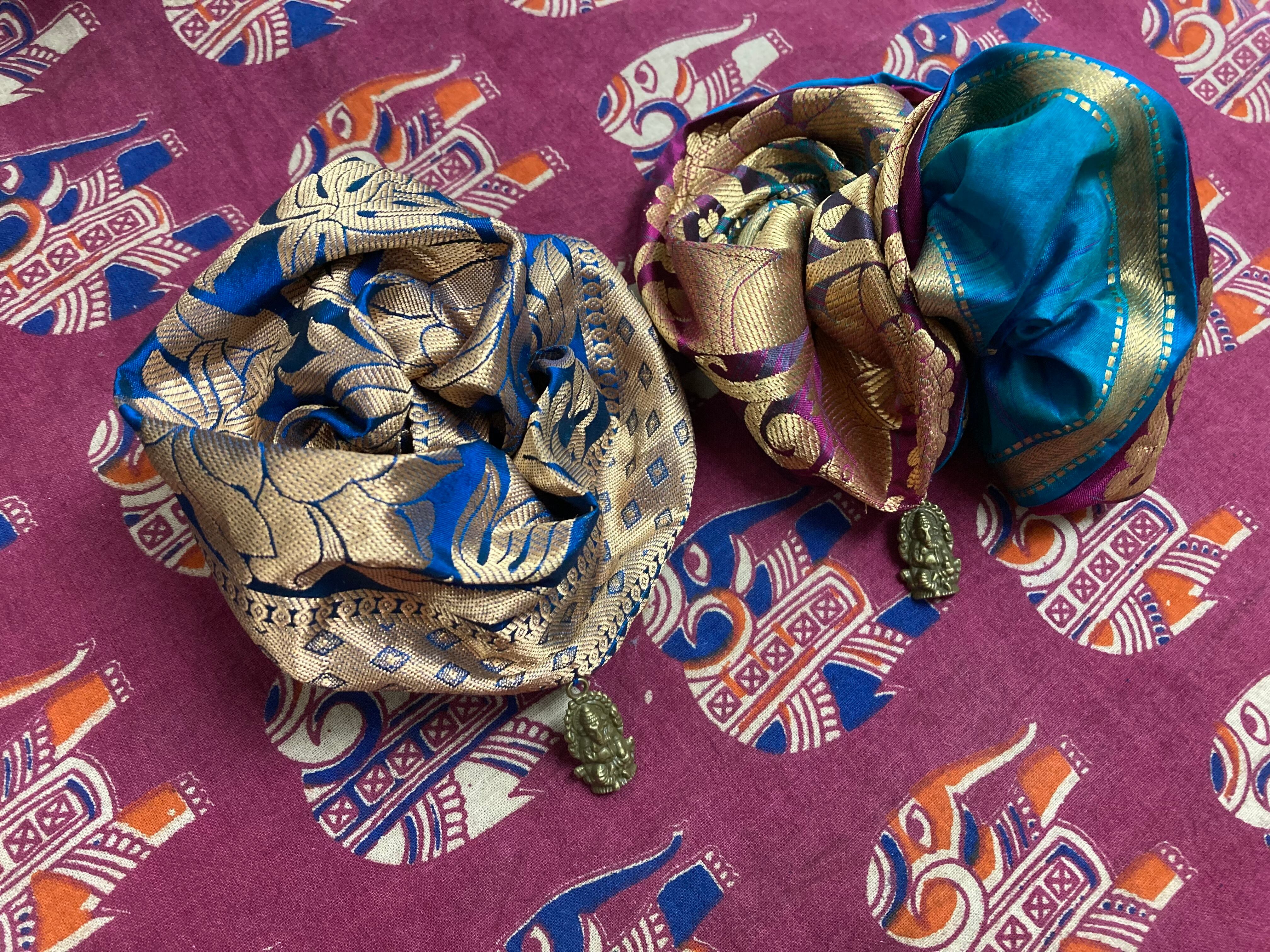 シルクのシュシュ(大) ガネーシャのチャーム付きは、華やかさと幸運が詰まった特別なアイテムです!シルク100%の高級サリー生地から仕立てたシュシュは、上質質感と光沢が魅力で、髪をまとめるだけでなく、ファッションのアクセントとしても活躍します。